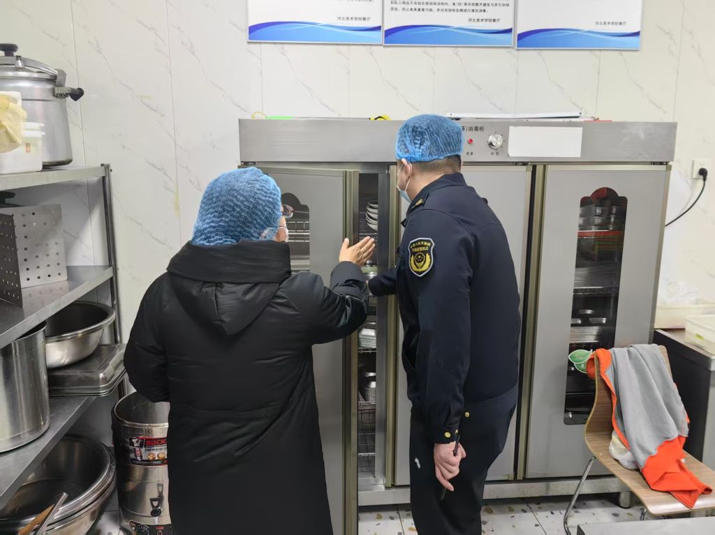 检查人员还查看了消毒设备的运行情况,要求务必保证餐具清洗消毒彻底,严格遵守操作规范,防止交叉污染。
