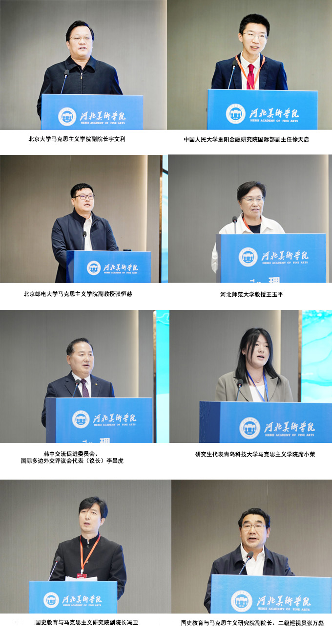 在大会主旨报告环节,北京大学马克思主义学院副院长宇文利以“人类命运共同体理念的深层意涵与中国文化基础”为题,中国人民大学重阳金融研究院国际部副主任徐天启以“特朗普2.0下中国扩大南南合作推动构建人类命运共同体前景”为题,北京邮电大学马克思主义学院副教授张恒赫以“人类命运共同体理念的三重创新”为题,河北师范大学教授王玉平以“从晏阳初世界IP到翟城村再度振兴”为题,韩中交流促进委员会、国际多边外交评议会代表(议长)李昌虎以“韩中文化交流与文明互鉴”为题,研究生代表青岛科技大学马克思主义学院席小荣以“人类命运共同体理念对马克思世界历史理论的创新升华研究”为题,国史教育与马克思主义研究院副院长冯卫以“人类命运共同体理念引领百德福海参肽从中国走向世界”为题,国史教育与马克思主义研究院副院长、二级巡视员张万彪以“经济全球化与人类命运共同体的战略构建”为题,依次作了大会主题发言。对这一理念的思想内涵、精髓要义、本质特征、内在逻辑、理论意义、实践价值、战略前瞻、策略步骤,以及河北省的具象实践与建议方案进行了高屋建瓴的研讨与论述。