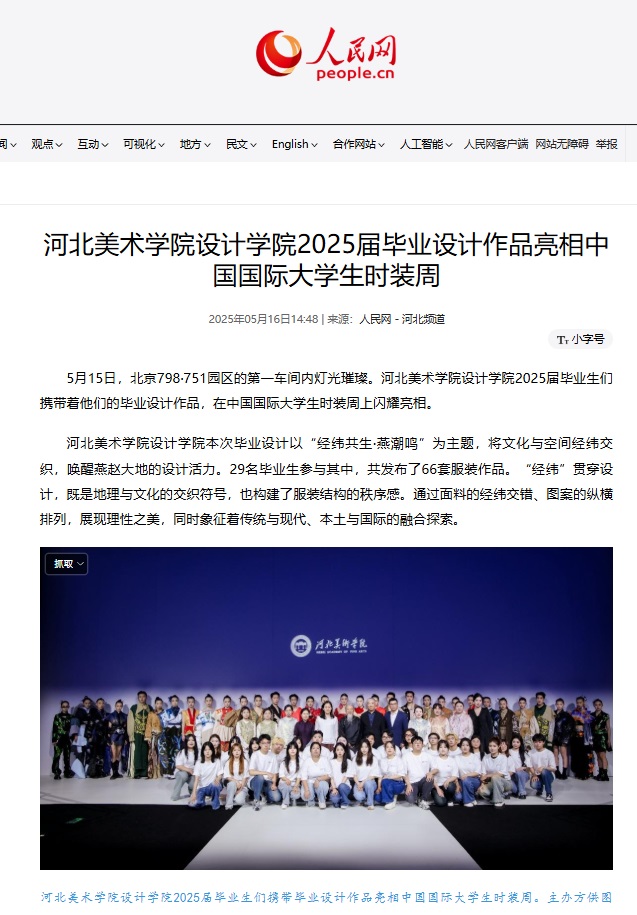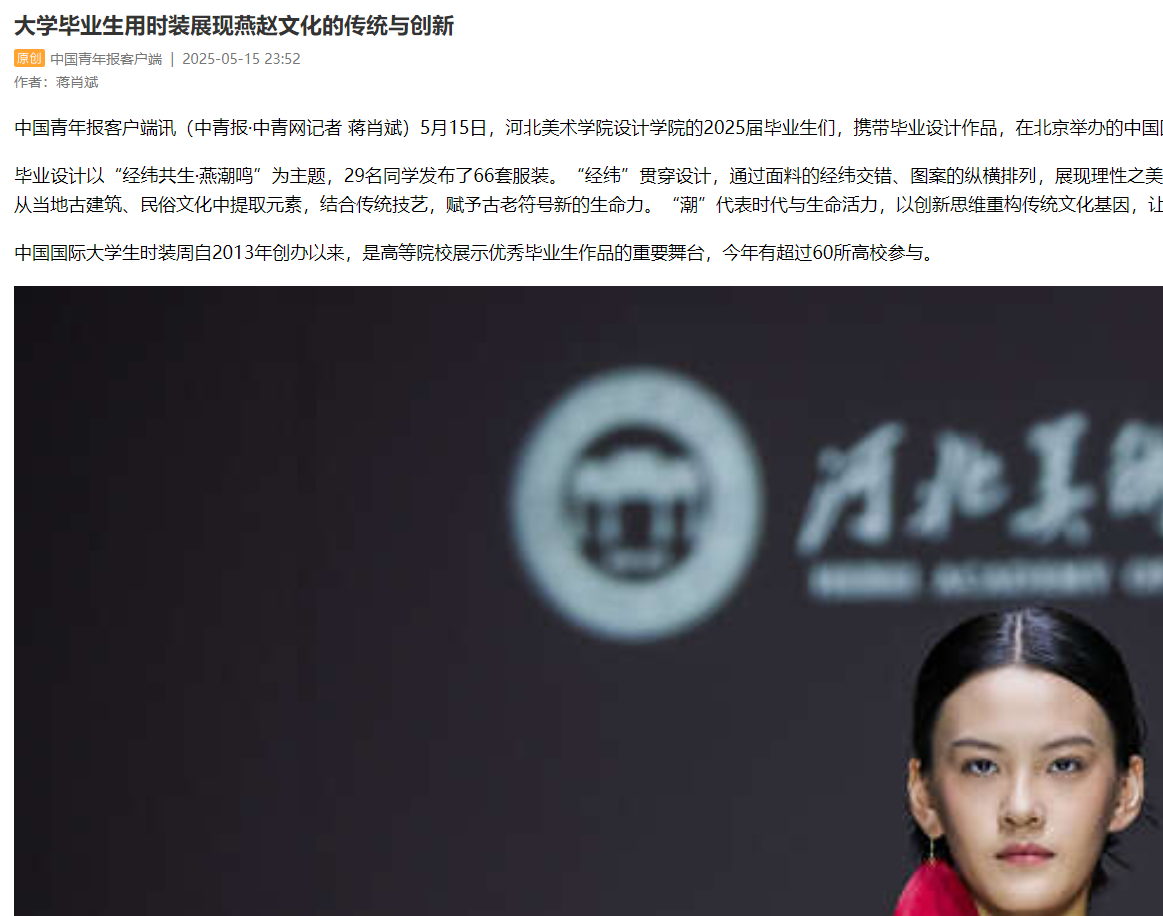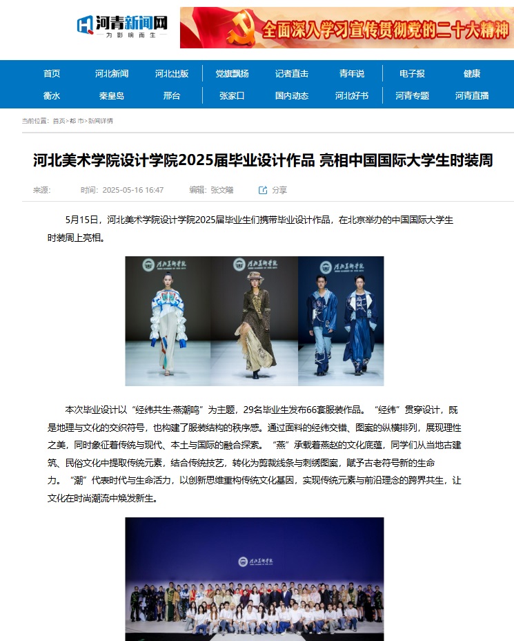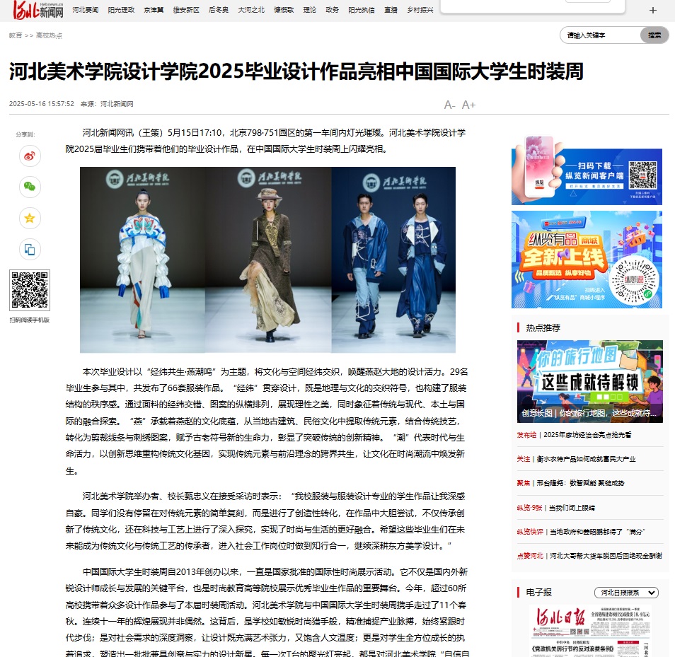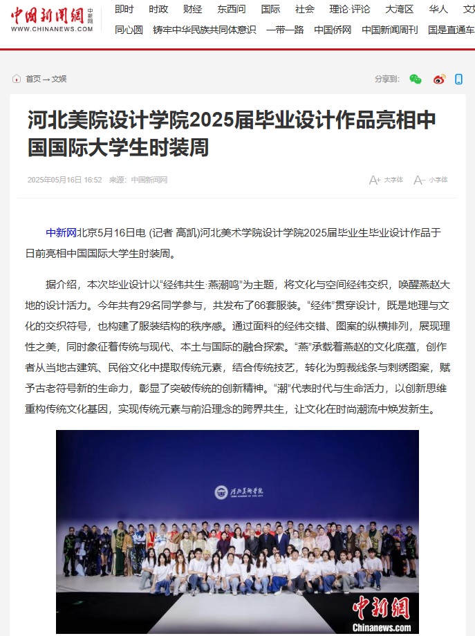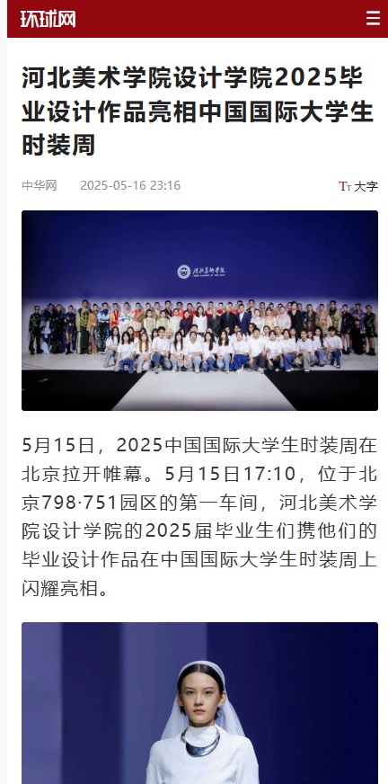 5月15日,best365官网设计学院2025届毕业设计作品亮相中国国际大学生时装周,受到人民网、凤凰网、中国教育报、中国青年报、央视频、中华网等30余家媒体的广泛关注和报道。