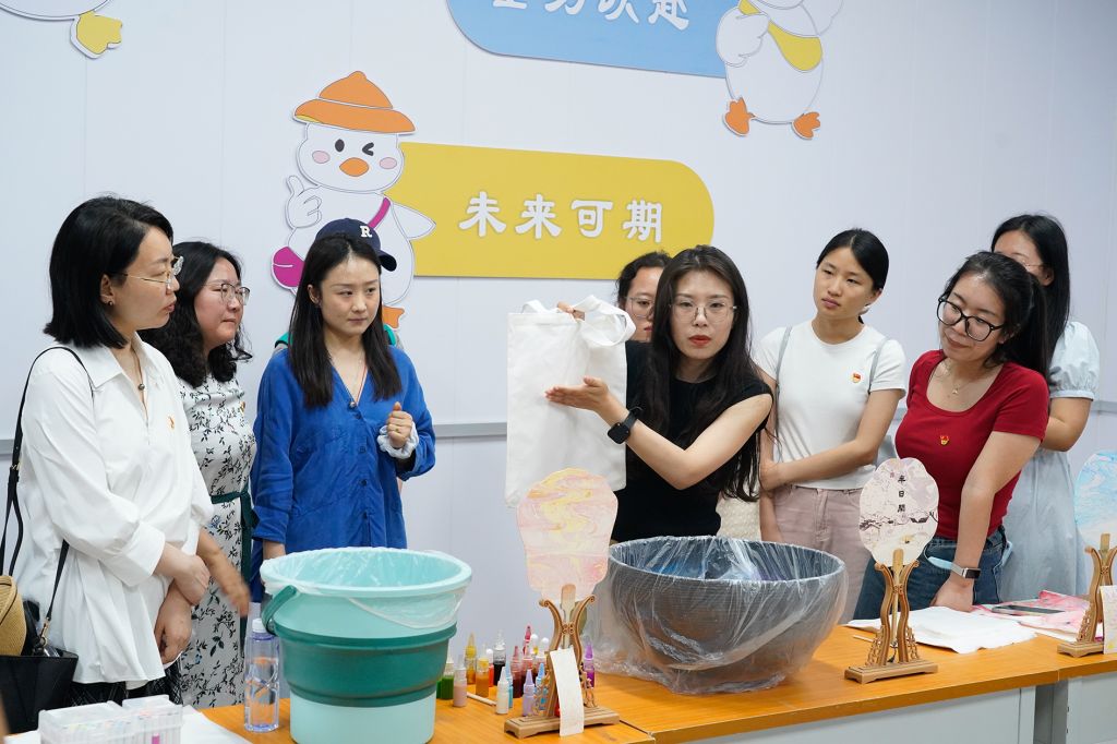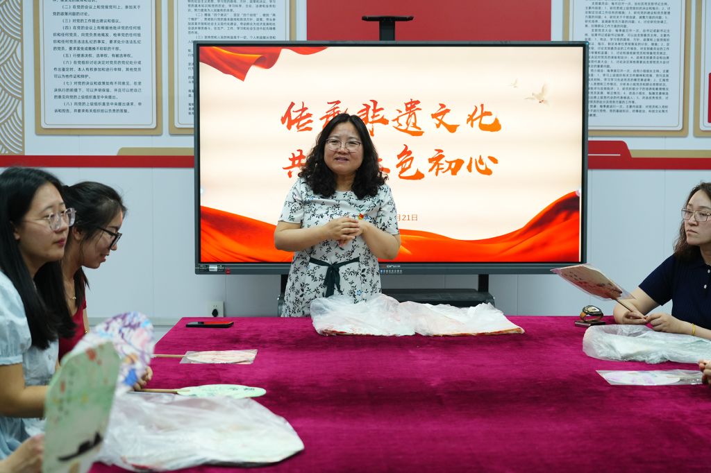 非遗专业教师孟琦详细阐述了中国漆艺的发展史以及非遗保护现状,解析了漂漆技艺中浮色原理、纹样创作等技法原理,并进行现场实践。实践环节融入10 分钟红色微党课,结合非遗作品解读“工匠精神、党员使命与廉洁操守”,让在场人员在欣赏作品的同时,深化党性教育和廉洁文化教育。