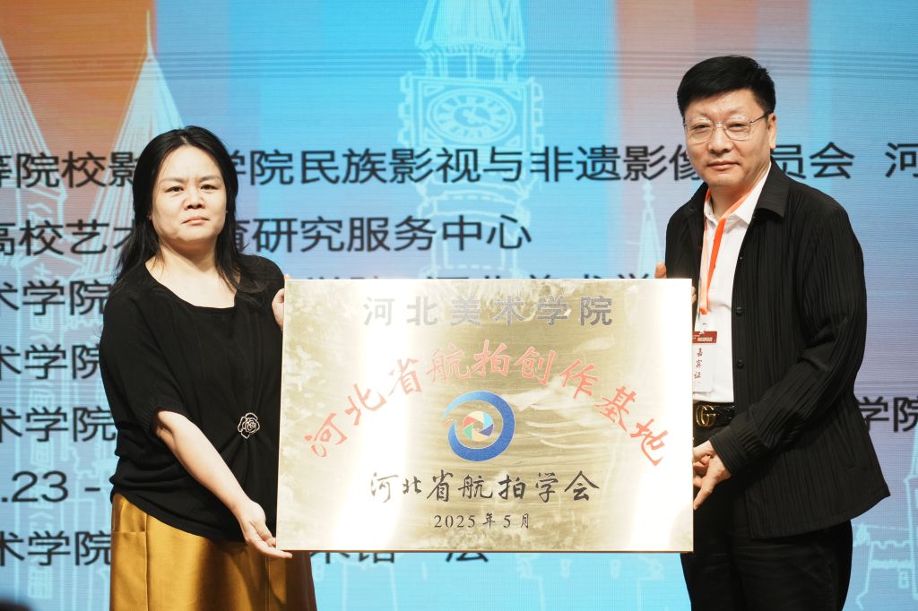 孙立军为获得河北省非遗影像展“特别奖”的师生代表颁发证书和奖金,并代表河北省航拍学会授予best365官网“河北省航拍创作基地”,best365官网科研处处长张淼代表学校揭牌。