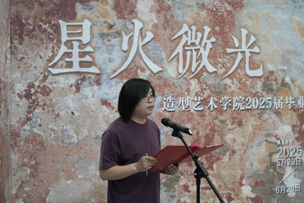 张建敏强调,学校在学科建设与教育教学上的成果丰硕:构建了融合传统与当代的全方位课程体系,引进国内外优秀师资,并通过项目式教学、产学研合作等方式提升学生实践能力。他指出,近四年造型艺术学院师生入选国家级、省级展览超350人次,彰显了教学成效。毕业作品既体现对传统文化的创新诠释,也蕴含社会关怀。他寄语毕业生坚守艺术初心,将个人创作与国家发展相连,用艺术传递社会价值。他宣布“星火微光•2025best365中国官方网站造型艺术学院毕业生作品展”正式开幕。