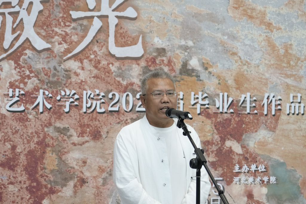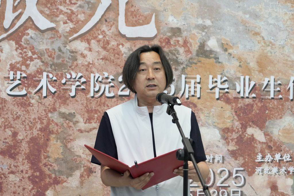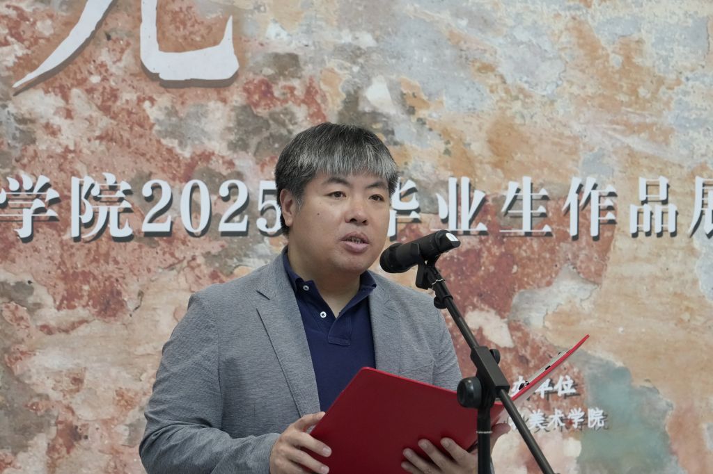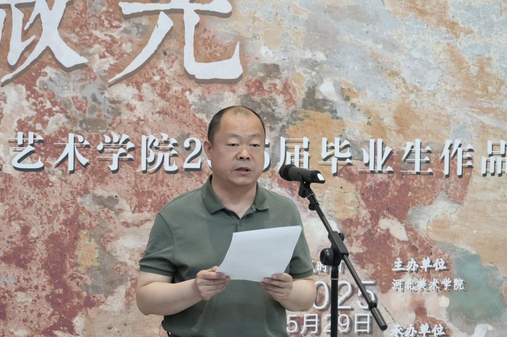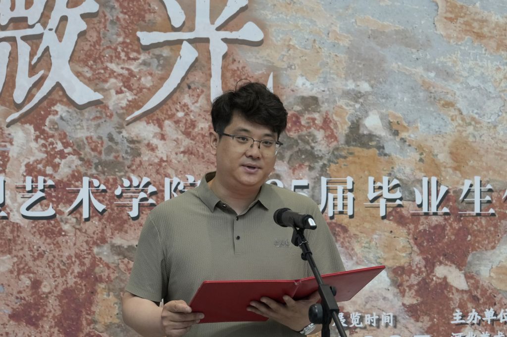 教师代表孟祥振回顾了学生四年的蜕变:从“迷茫的白纸”到“破茧成蝶”,历经挑灯创作、灵感枯竭与完成喜悦。他指出,作品包含对传统的致敬与当代的创新,多元媒介展现独特思考,无论是写实细腻或抽象奔放,皆彰显专业素养与创新精神。他寄语毕业生保持对艺术的敬畏与探索热情,视挫折为成长契机,并强调“毕业展是终点,更是迈向广阔艺术舞台的新起点”。