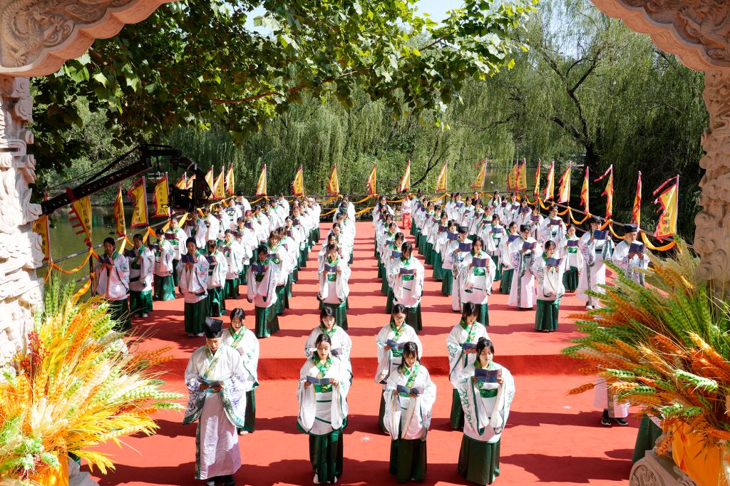汉帜飞扬,鼓乐齐奏。上午8时30分,钟鸣和“启户”声响起,朱门大开,六十四舞者执羽而入,八佾舞翩跹舒展。众师生身着汉服,缓步行至殿前,庄重而立。