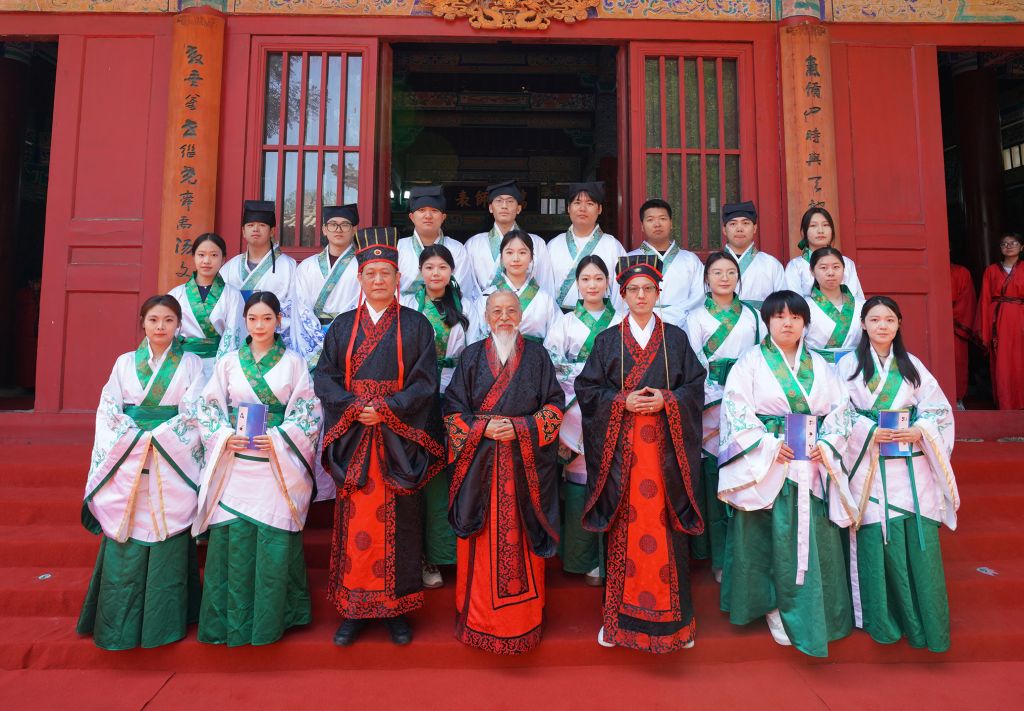众学子高声齐诵《孔子赞》,声浪激荡回廊。然后行三拜之礼:一拜父母恩,春晖寸草育栋梁;二拜师者谊,杏坛授业传薪火;三拜母校情,春风化雨润芳华。礼成后,学子依次入殿完成仪式。
