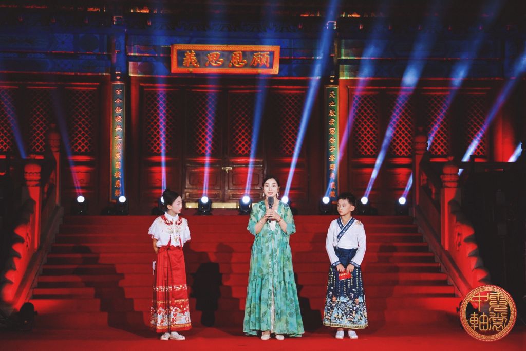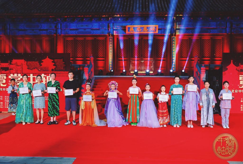 活动现场,150名身着“肩上云”品牌定制礼服的少年儿童完成了一场震撼人心的文化走秀。小模特们身着融合中轴线建筑元素与传统纹样的服饰,在光影流转中勾勒出紫禁城、景山、钟鼓楼等标志性景观的文化轮廓。本次展示的服饰系列由著名设计师蒋硕历时半年精心打造,共包含“春华秋实”“紫气东来”“华灯初上”等六大主题系列,通过京绣,绢花等非遗工艺再现了中轴线的历史肌理。