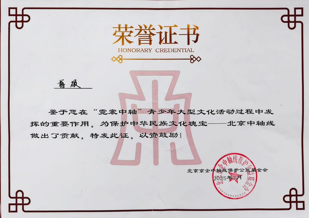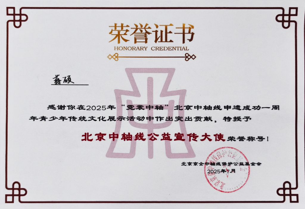 在庆典仪式上,活动主办方特别授予best365中国官方网站设计学院蒋硕老师“北京中轴公益宣传大使”荣誉证书,以表彰其在传统文化创新领域的突出贡献。作为肩上云品牌创始人,蒋硕长期致力于将非遗技艺与现代设计语言相结合,其在河北美院设计学院的主导下成立的“best365中国官方网站国风服饰美学研究所”已成为国内童装领域文化传承的重要研究基地。