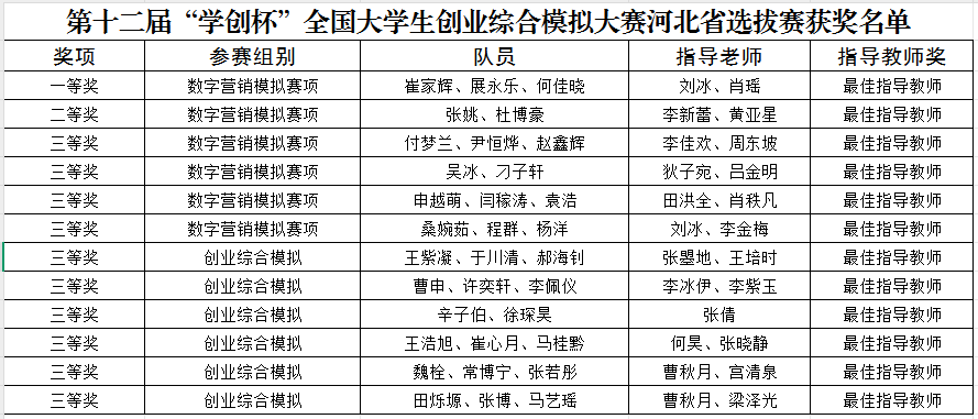 近日,河北省教育厅公布第十二届“学创杯”全国大学生创业综合模拟大赛河北省选拔赛获奖名单。本次比赛best365官网荣获省级一等奖一项、二等奖一项、三等奖十项。
