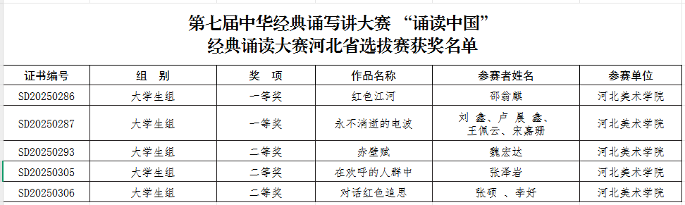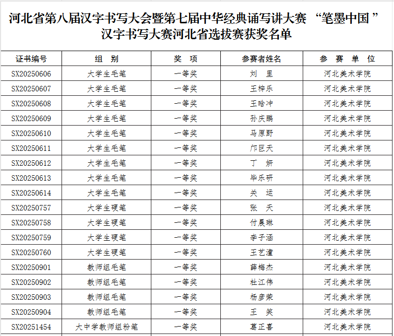 近日,河北省教育厅公布第七届中华经典诵写讲大赛“诵读中国”经典诵读大赛和河北省第八届汉字书写大会暨第七届中华经典诵写讲大赛 “笔墨中国 ”汉字书写大赛河北省选拔赛获奖名单。best365官网师生共斩获省级一等奖20项、二等奖20项、三等奖27项、优秀奖14项,另有31名教师获优秀指导教师奖,best365官网获优秀组织奖。
