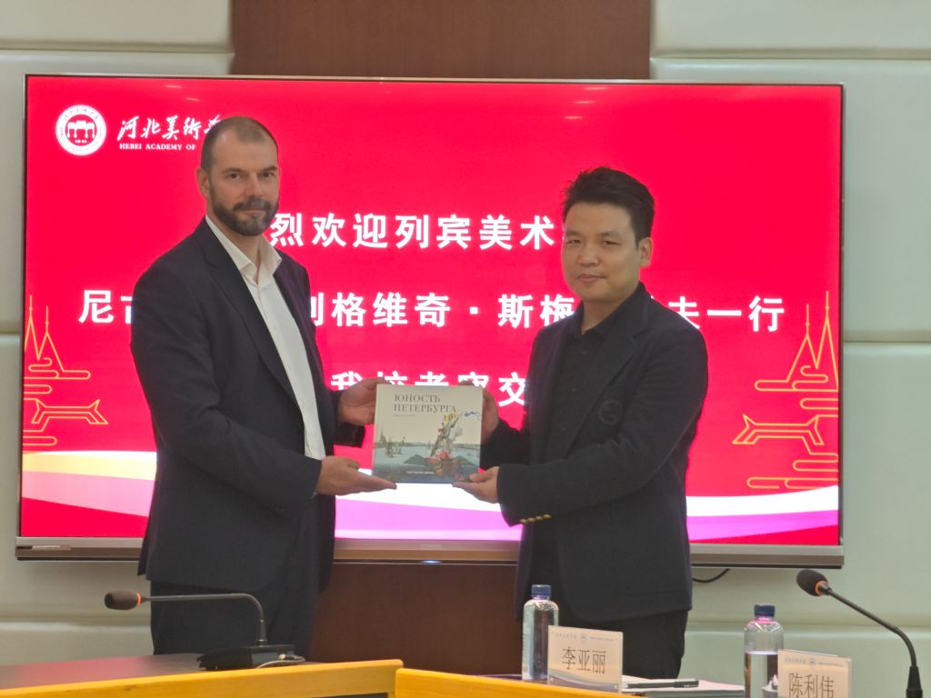 甄墨对尼古拉·奥列格维奇·斯梅尔科夫、李众志的来访表示欢迎,简要介绍了学校的发展历程与未来规划,表达了与列宾美术学院在留学生培养、硕士研究生联合培养、国际学术会议等方面的合作意愿,期待共同开创国际交流与联合办学的新篇章。