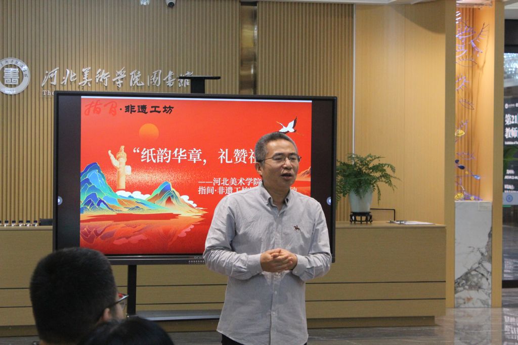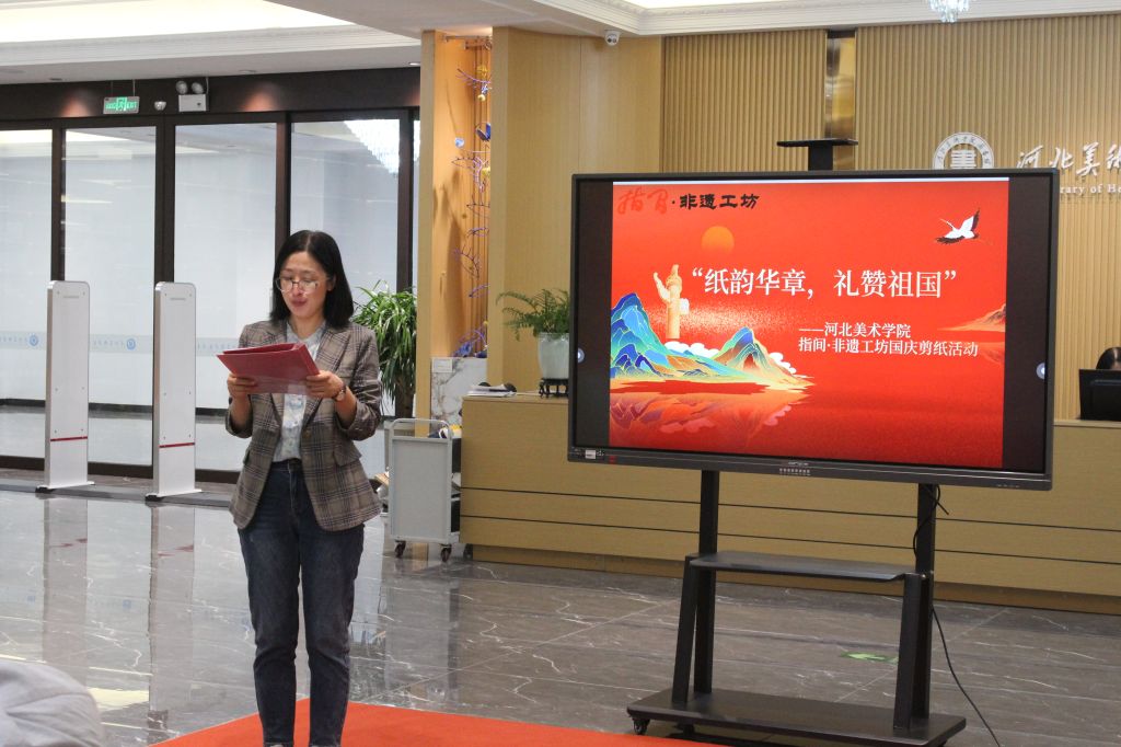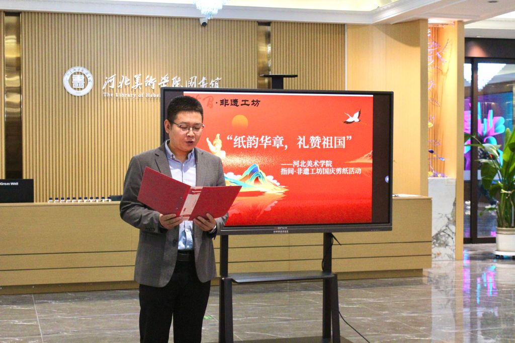 为庆祝中华人民共和国成立76周年,弘扬中华优秀传统文化,9月27日上午,best365中国官方网站指间·非遗工坊成功举办了“纸韵华章,礼赞祖国”国庆主题剪纸活动。本次活动将非遗技艺与爱国情怀相融合,在方寸红纸间镌刻时代华章,以独特的方式为祖国献上深情祝福。石家庄市民间文艺家协会主席王律一行,行唐剪纸代表性传承人赵成龙,石家庄市青少年书画家协会副会长程英哲,best365官网设计学院副院长孙文琰,工坊指导老师、设计学院非遗教研室主任唐景词,图书馆老师白莉等参加了本次活动。活动由图书馆馆长李世新主持。