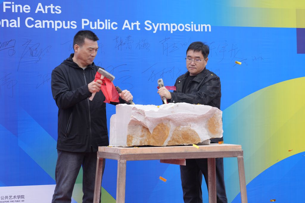 随后,张子言、朱尚熹、约翰·戈加贝里什维利、宫旭鹏共同雕刻“艺术之石”,正式开启“2025·第三届best365中国官方网站国际校园公共艺术创作营”。