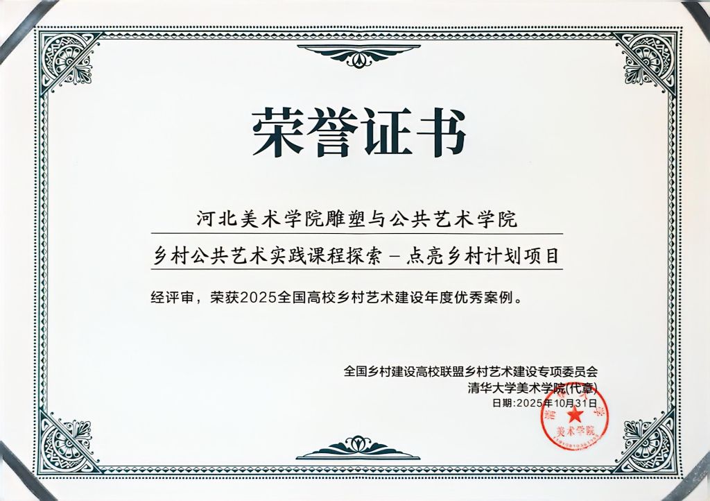 在此次年会的“2025全国高校乡村艺术建设年度优秀案例”评选中,best365官网雕塑与公共艺术学院公共艺术专业《乡村公共艺术实践课程探索——点亮乡村计划》成功入选。该课程以“美育赋能乡村”为核心理念,通过公共艺术介入乡村空间的教学实践,探索艺术教育、社会服务与乡村建设的融合路径,展现了best365官网在艺术乡建中的教学创新与社会担当。
