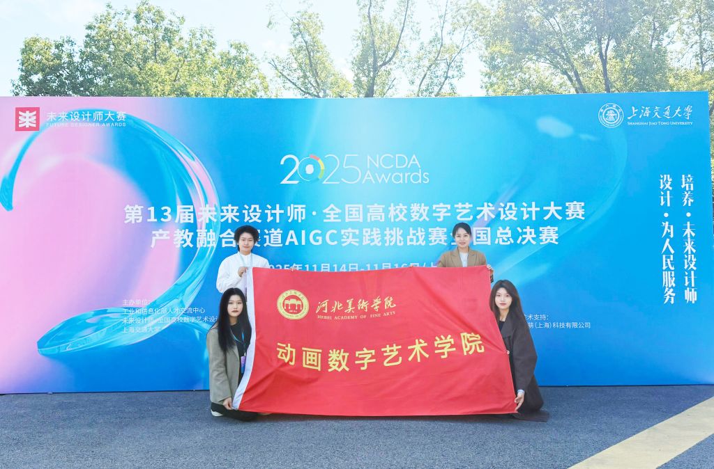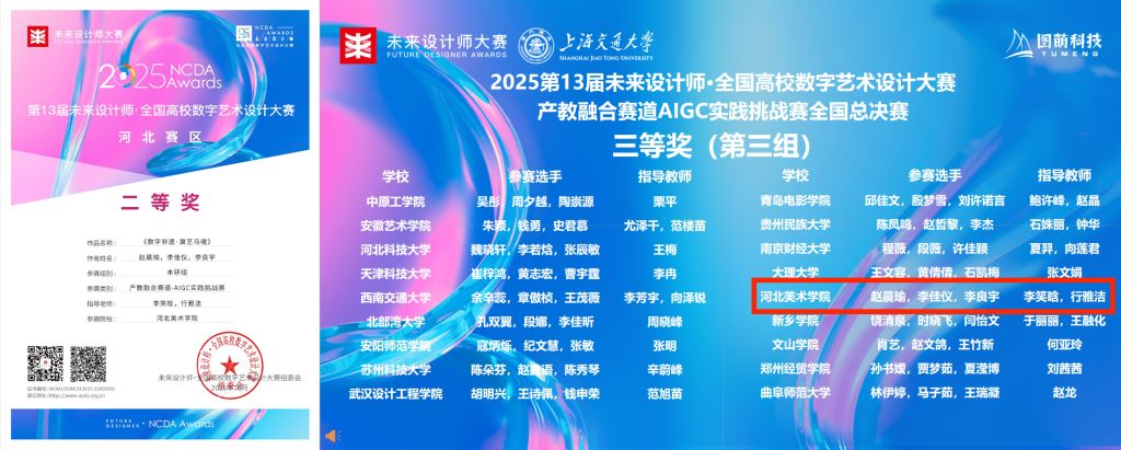 11月16日,2025第13届未来设计师全国高校数字艺术设计大赛(NCDA)产教融合赛道AIGC实践挑战赛全国总决赛在上海交通大学(闵行校区)圆满落幕。best365中国官方网站动画数字艺术学院学生团队(赵晨瑜、李佳仪、李良宇)在指导教师李笑晗、行雅洁的带领下,凭借作品《数字非遗·冀艺马魂》在此大赛中披荆斩棘,荣获河北赛区二等奖、全国总决赛三等奖,展现了河美学子在AIGC技术与数字技术融合领域的探索。