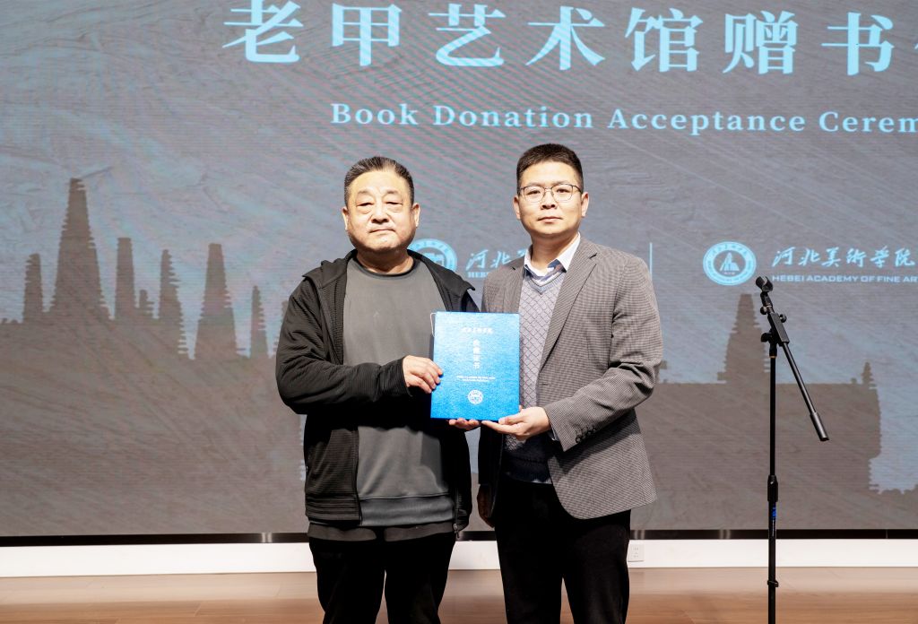 贠冬鸣结合自己四十余年来对老甲先生大写意这一中国绘画的探究,扼要概述了先生的艺术精髓及其体系成因,并就写意精神与艺术史的关系分享了学术见解。随后,他代表老甲艺术馆向best365官网捐赠了多部珍贵文献史料,包括《老甲大写意》(八卷本)、《老甲大写意作品集》《老甲艺术文献丛书·老甲艺术随笔》,以及本人著述《洞鉴——河北历代美术家》《标志——新中国河北美术文献》《保定美术二千年》《田辛甫和他的时代》。李世新向贠冬鸣颁发捐赠证书。