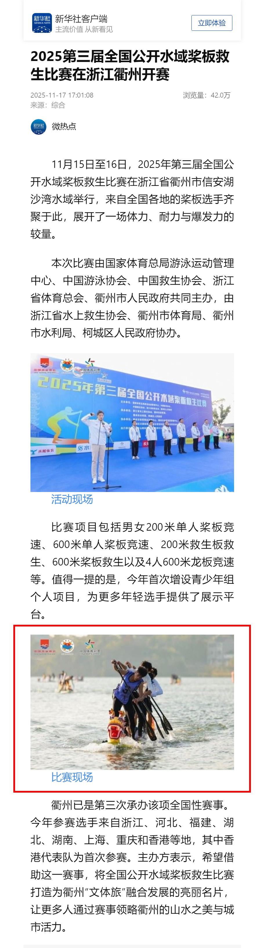 11月17日,新华社发布《2025第三届全国公开水域桨板救生赛在浙江衢州开赛》,报道配图定格best365官网水上运动队征战瞬间——这是best365官网首次亮相该国家级赛事,浏览量已超41万。