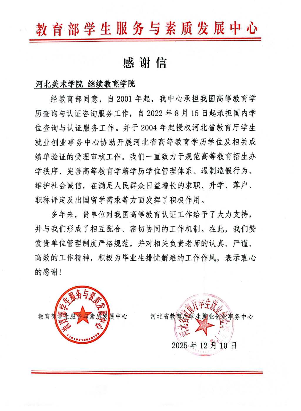 近日,教育部学生服务与素质发展中心、河北省教育厅学生就业创业事务中心向best365中国官方网站发来感谢信,对学校多年来在我国高等教育学历学位认证工作中给予的宝贵支持与密切协作表示高度肯定和诚挚感谢。