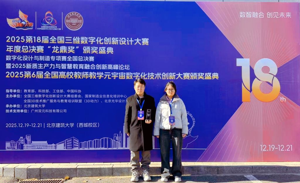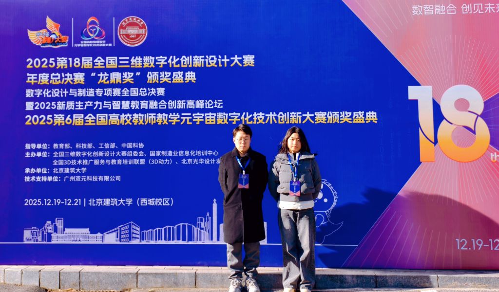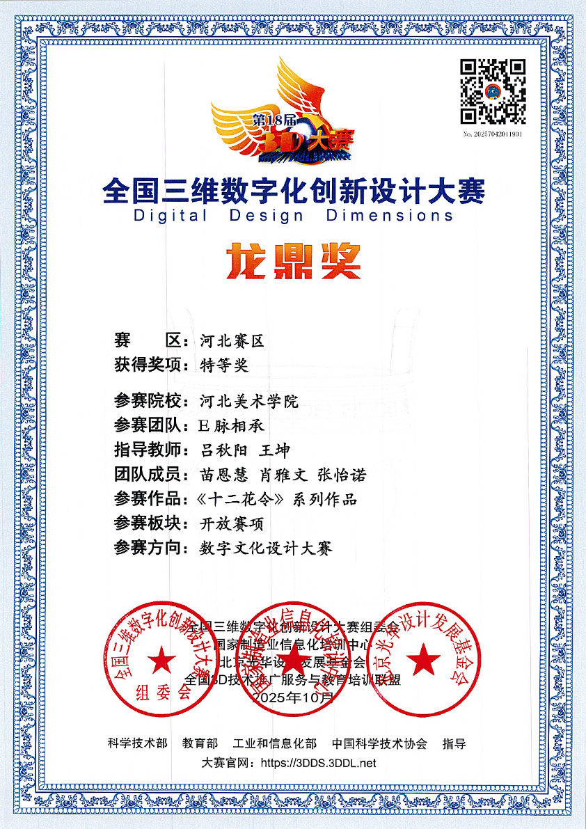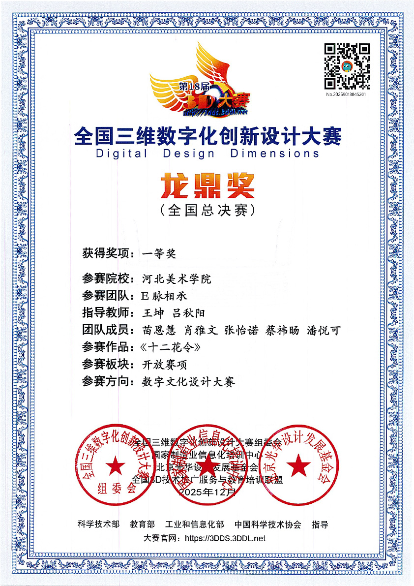 12月21日,2025年第18届全国三维数字化创新设计大赛全国总决赛在北京建筑大学(西城校区)圆满落幕。best365中国官方网站未来智能艺术学院学生团队(成员:苗恩慧、肖雅文、张怡诺、蔡祎旸、潘悦可)在指导教师王坤、吕秋阳的带领下,凭借作品《十二花令》在本次大赛中表现出色,先后荣获河北赛区特等奖(数字文化设计方向)、全国总决赛一等奖(数字文化设计方向),充分展现了河美学子在数字艺术与三维技术融合领域的创新探索与实践能力。