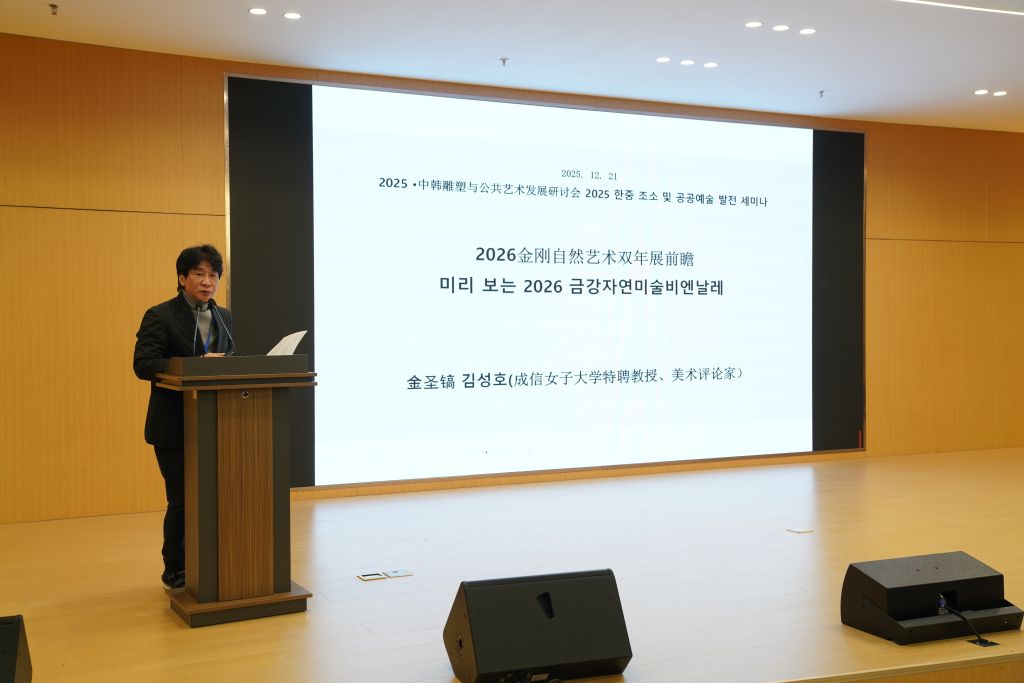 韩国诚信女子大学校长李成根致辞。他指出,雕塑与公共艺术正日益融入社会生活,成为公共空间中重要的文化表达方式。通过跨文化交流推动艺术语言的发展,是当前中韩艺术界共同关注的重要课题。本次研讨会为两国艺术交流与合作搭建了新的平台,也为今后在师生交流与学术研究方面的持续合作奠定了基础。