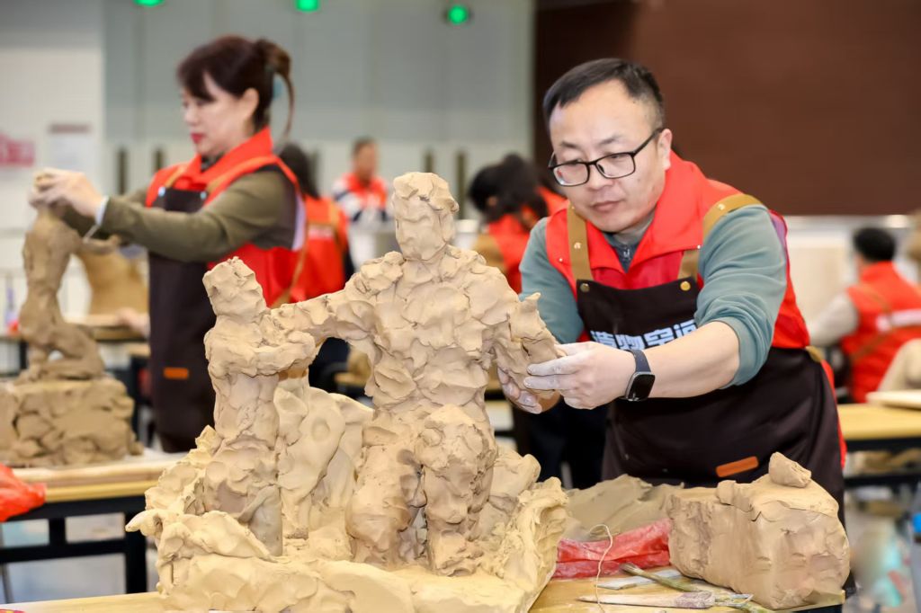 在实操环节中,王昭辉老师沉着发挥,将传统陶瓷雕塑技艺与现代审美理念深度融合。他运用拍、捏、塑、挖、压等多种技法,以140余斤陶泥现场创作了作品《温暖的草方格》。该作品以精巧的构图、鲜明的主题和细腻的人物刻画,生动呈现了孩童为治沙工人送热水的温情场景,既体现了治沙人的坚守与奉献,也寓意着绿色希望与科技精神的代际传承。作品以其深刻的文化内涵和艺术感染力,赢得了评委的高度认可。