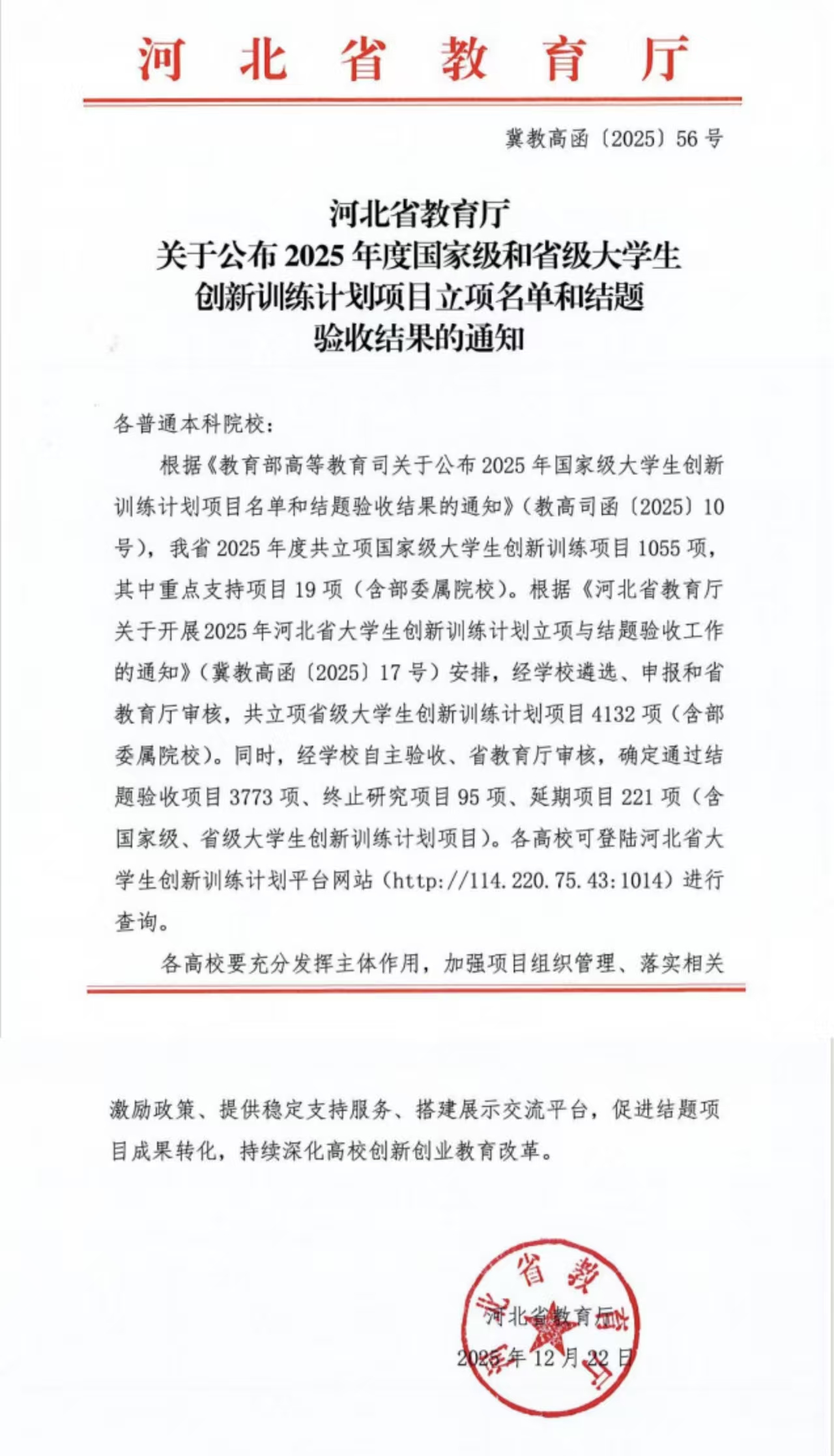 近日,河北省教育厅公布《2025年度国家级和省级大学生创新训练计划项目立项名单和结题验收结果的通知》(冀教高函〔2025〕56号)。经学校遴选、自主验收、申报及省教育厅审核,best365官网2024年度立项的20个省级大学生创新训练计划项目全部顺利通过结题验收,2025年度新获批省级立项30项,立项数量与结题质量均实现稳步提升,彰显了best365官网创新创业教育改革的扎实成效。