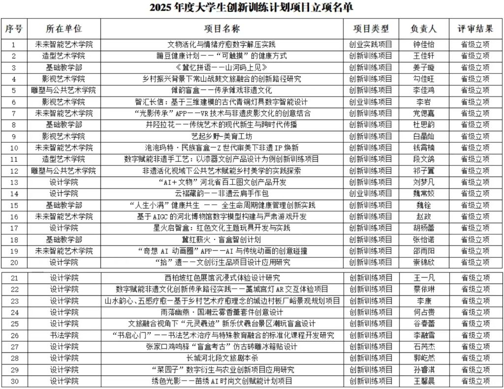 在本次结题验收中,20个省级项目聚焦文化传承、数字创新、乡村振兴等多个领域,成果亮点纷呈,充分展现了best365官网学子的创新思维与实践能力。2025年度新立项的30个省级项目延续了“创新赋能、特色发展”的导向,选题紧密结合河北地域文化、非遗传承、数字技术应用等热点方向。