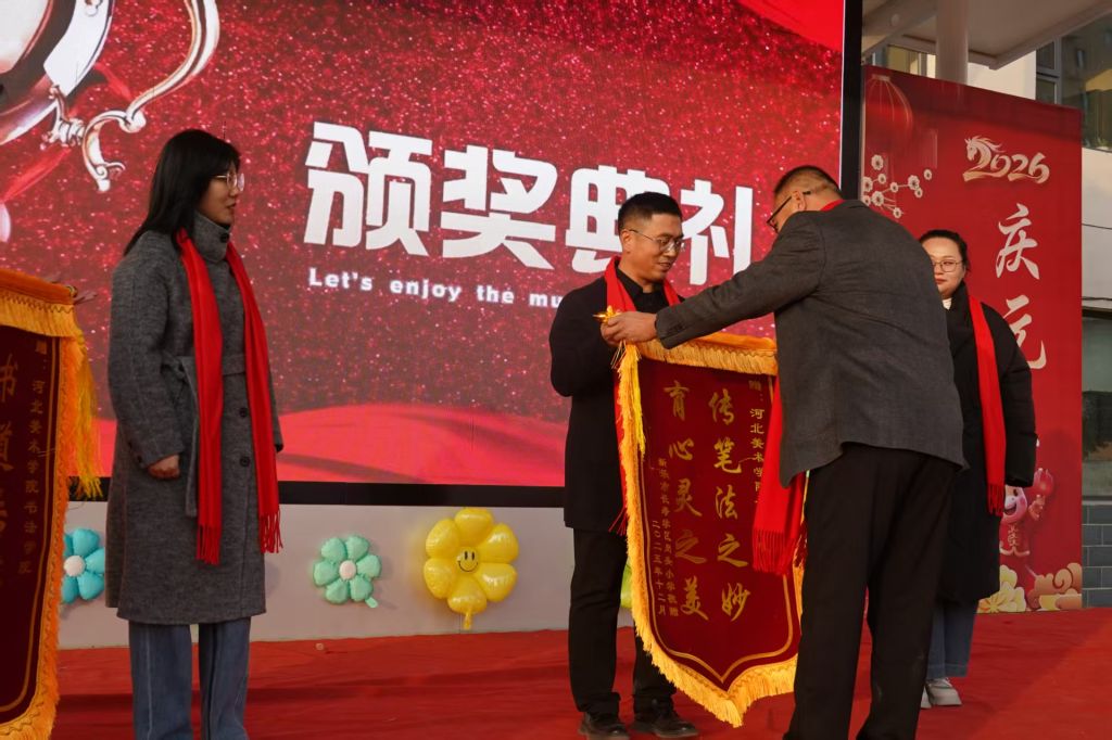 张政良、代晴、赵莲如分别为堽头小学期末书法比赛一、二、三等奖获奖学生颁奖;新乐市堽头小学校长为优秀支教志愿者代表颁发荣誉证书,向他们的辛勤付出致以诚挚谢意。