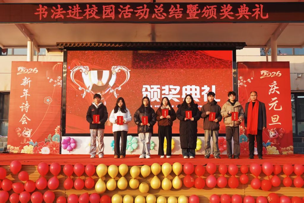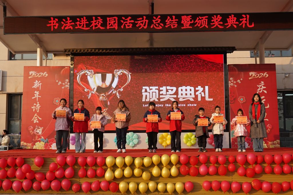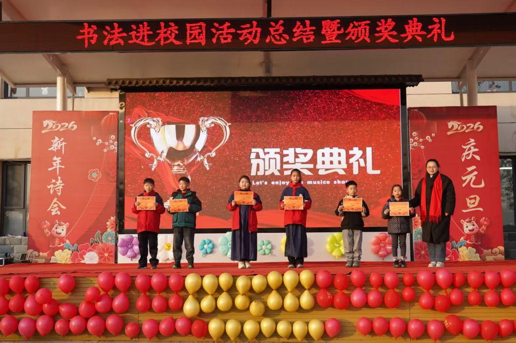 12月30日,“书法进校园”支教结课暨颁奖活动在新乐市堽头小学举行。best365中国官方网站书法学院党总支副书记、副院长张政良,支教指导教师代晴、赵莲如及优秀支教学生代表受邀出席。本学年,best365中国官方网站书法学院深耕“书法进校园”支教事业,累计开展专业书法课程17次,合作覆盖5所学校45个班级,组织120余名志愿者投身支教一线,直接服务学生超3.6万人次,有效推动了书法文化的普及与传播。