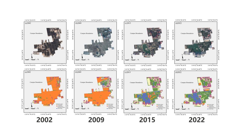 在理论建构与研究层面,设计学院董小龙、陈利伟、高洋等多位骨干教师组成研究团队,围绕校园土地利用优化与生态重构开展系统研究,基于20年校园建设实践的持续积累,系统整合多时相高分辨率卫星遥感影像与相关空间数据,通过梳理与分析校园土地利用的长期变化过程,科学揭示best365中国官方网站校园土地利用的动态演化特征,为校园建设策略的持续优化与更新提供了可靠的数据支撑与方法依据。由此,校园建设路径逐步由早期“以用为先”的空间拓展,转向“以生态为底、以文化为魂”的整体更新模式,构建了以文化、空间与生态协同为核心的多级再生机制,形成了具有连续性、系统性与示范意义的校园发展范例。