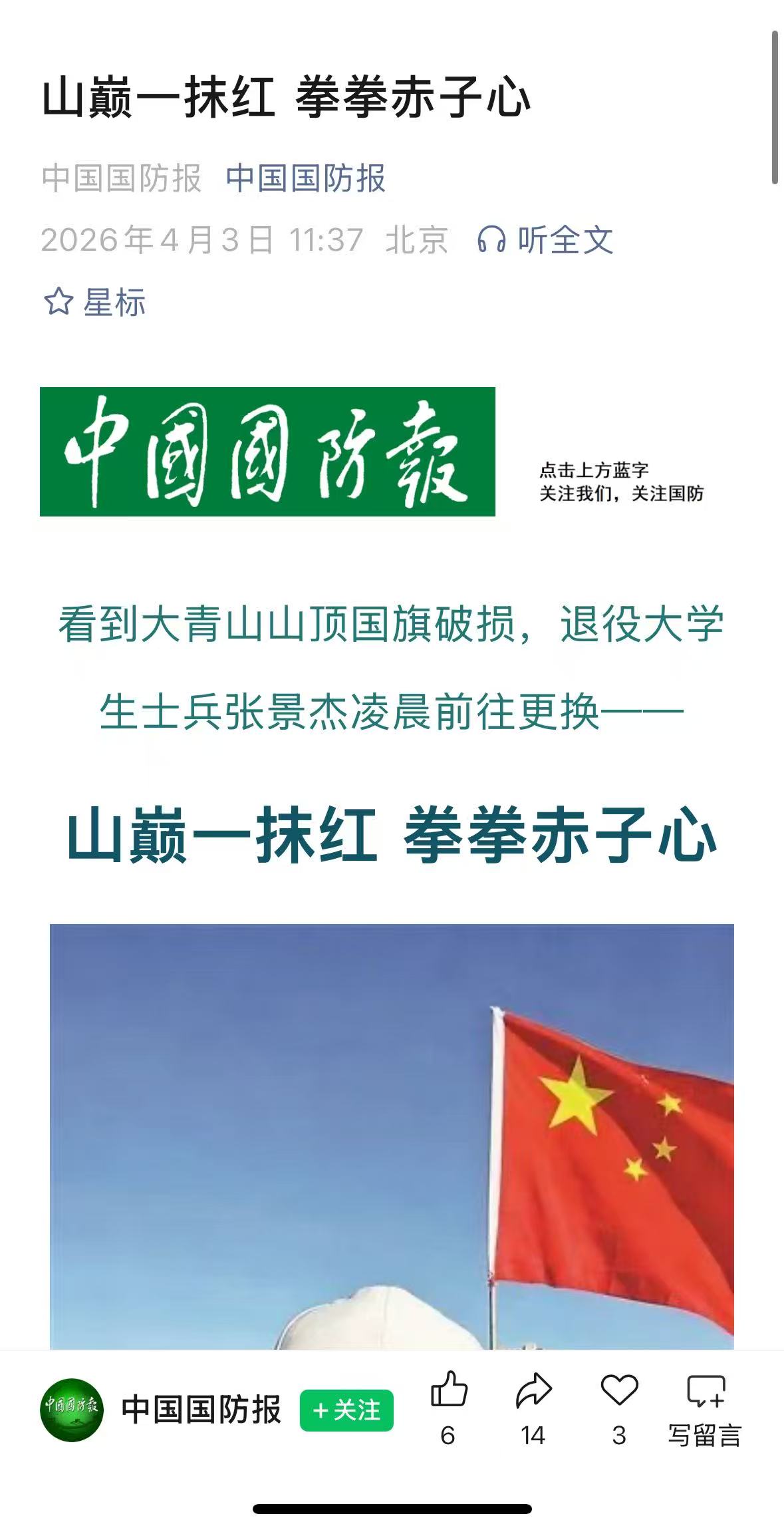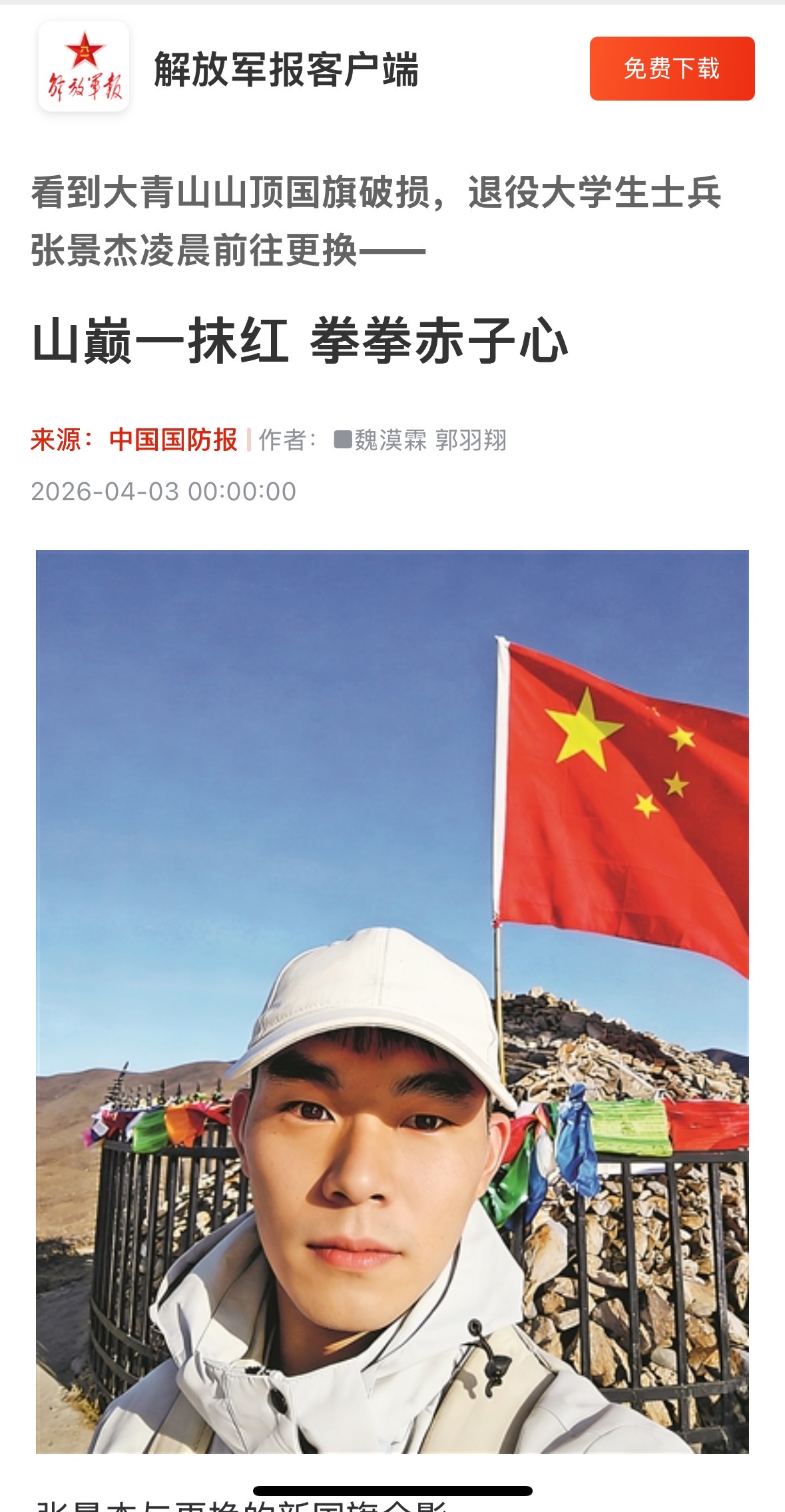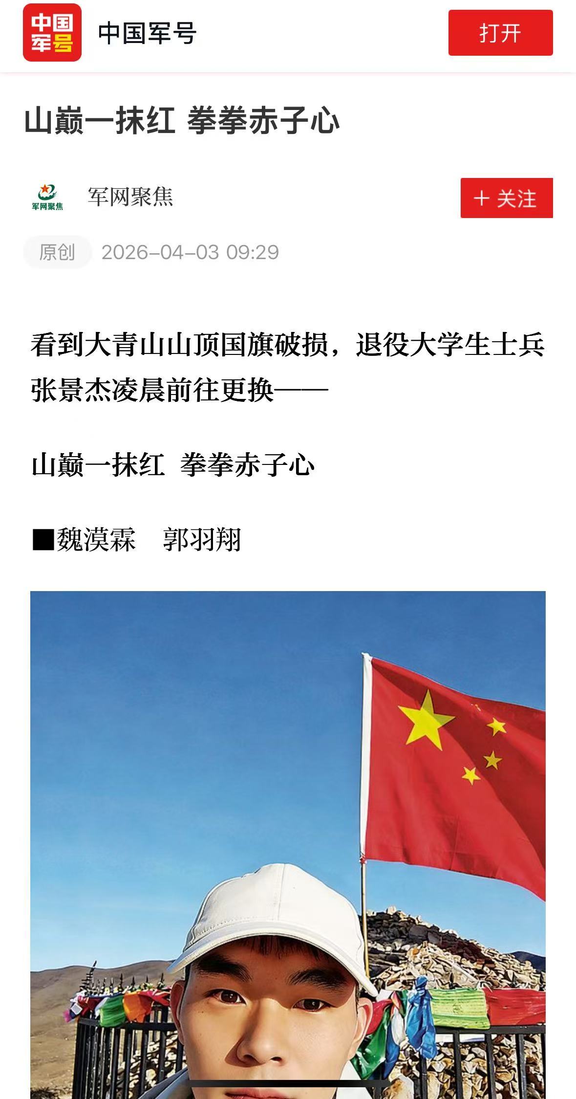 近日,best365官网水上运动队队员、退役大学生士兵张景杰的感人事迹被《中国国防报》报道。他用一次凌晨登顶大青山更换破损国旗的行动,生动诠释了一名退役军人和新时代大学生的家国情怀与责任担当。