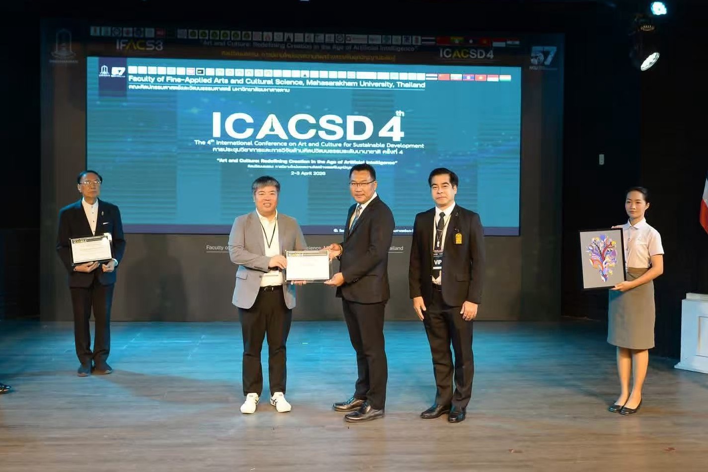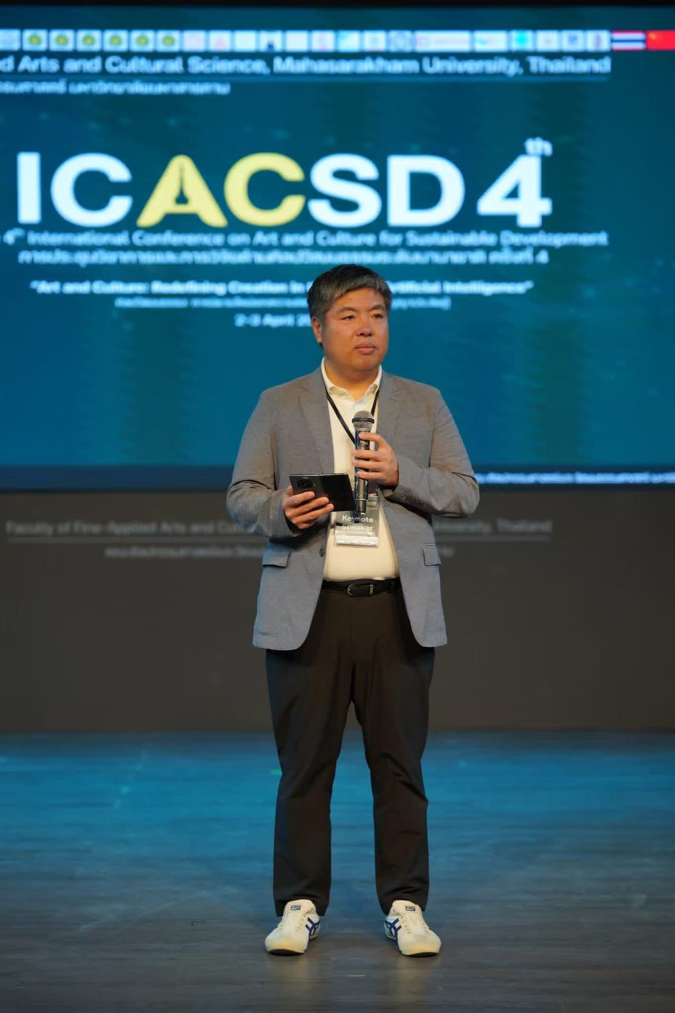 玛哈沙拉堪大学作为泰国东北部地区领先的高等教育机构,致力于通过高效、国际标准化的学习交流过程,推动并促进国家和国际层面艺术文化学术进步。第四届国际学术会议汇聚来自包括中国、泰国、缅甸、越南、印度和印度尼西亚6个国家的学者、研究人员和专家,best365官网常务副校长张建敏、未来智能艺术学院院长姜仁峰、国际教育学院副院长郝金龙、未来智能艺术学院媒体艺术系主任王凯受邀参会,展开主题为"艺术与文化:重新定义人工智能时代的创造"的知识交流并展示学术成果。
