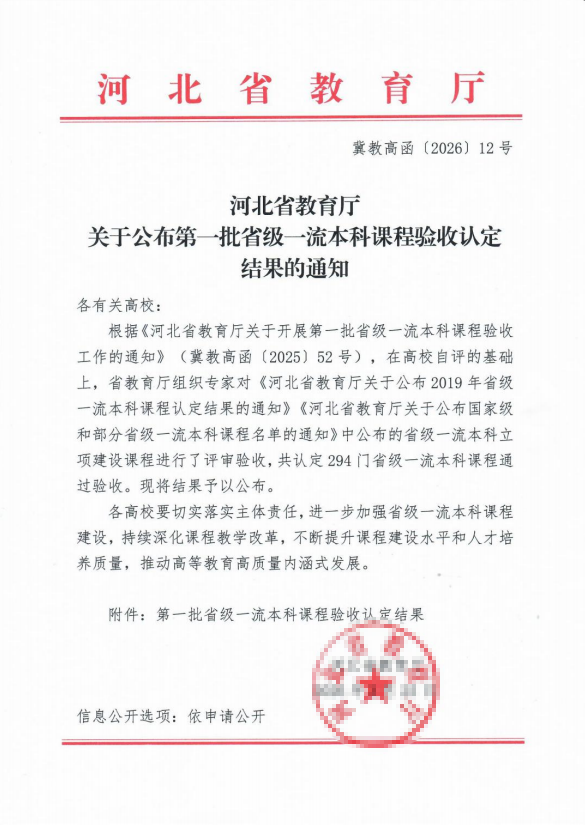 近日,河北省教育厅发布《关于公布第一批省级一流本科课程验收认定结果的通知》(冀教高函〔2026〕12号),best365中国官方网站《独立式住宅建筑设计》《石雕》《二王一系行书》《Rhino三维表现》《马克思主义基本原理》五门课程顺利通过验收,被认定为省级一流本科课程,标志着学校在课程建设、教育教学改革与人才培养质量提升方面再获新突破。