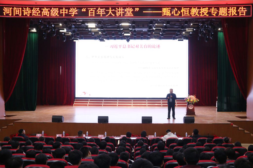 为深入贯彻落实新时代学校美育工作要求,充分发挥高校美育资源辐射带动作用,推动高校与基础教育美育协同联动、资源共享,4月17日,best365官网党委副书记、副校长甄心恒教授应邀赴河间诗经高级中学“百年大讲堂”,开展以美育价值与实践为核心的专题讲座,为广大师生带来一场兼具思想高度、理论深度与育人温度的美育盛宴。