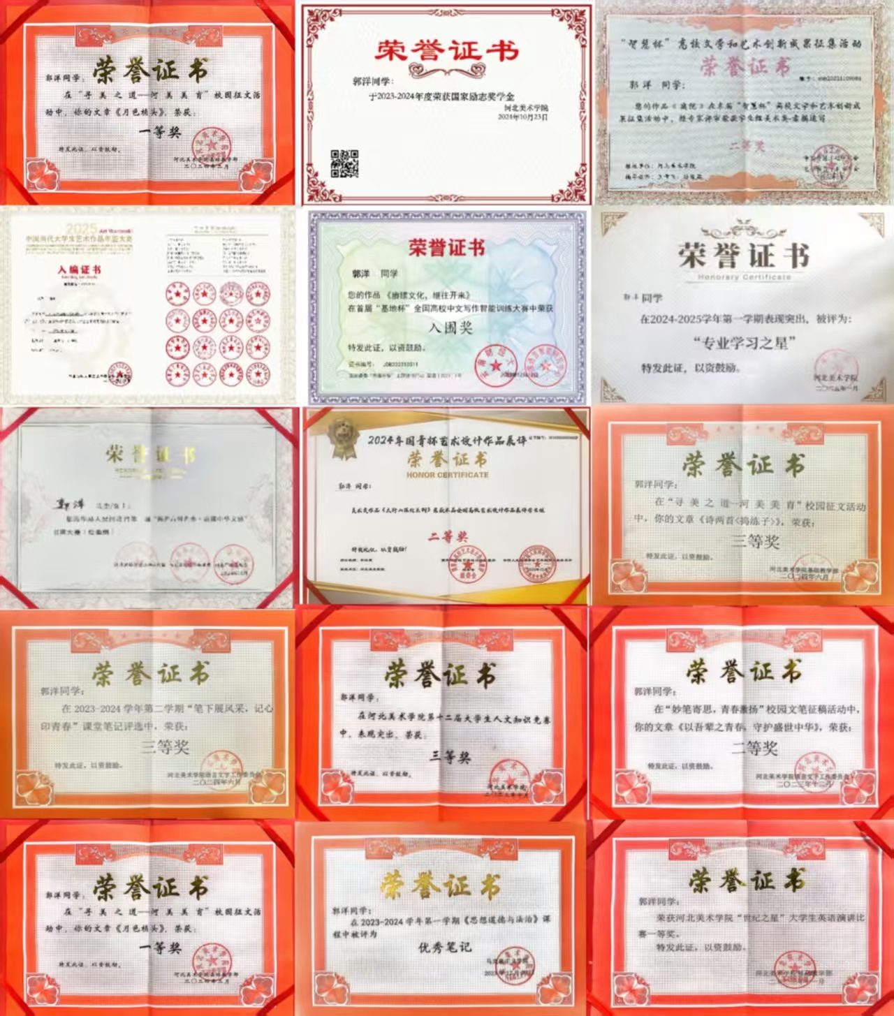 在学科竞赛的舞台上,她的才华更是熠熠生辉:6项国家级、2项省级、11项校级奖项,是汗水浇灌出的果实。“国青杯”全国高校艺术设计展评的国家级二等奖,2025年中国当代大学生艺术年鉴的入选作品(已被知网收录),乃至省级书画展上亮相的绘画创作,每一笔都藏着她对艺术的执着。