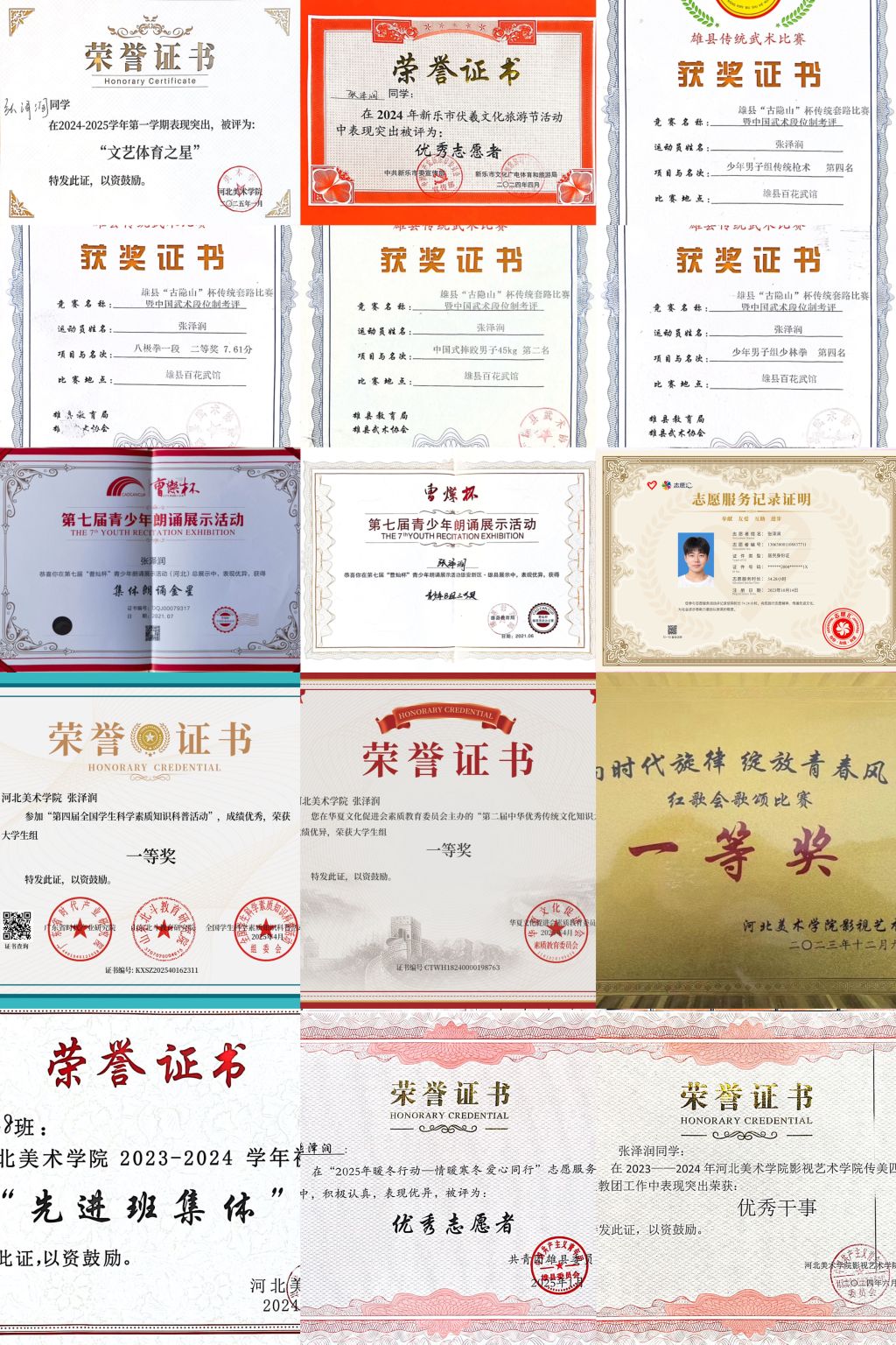 在多元舞台上,他以锲而不舍的韧劲绽放光彩。张泽润的荣誉簿上,镌刻着奋斗的印记:国家级奖项2 项(第四届 “全国学生科学素质知识科普活动” 一等奖、第二届 “中华优秀传统文化知识大会” 一等奖),省市级奖项 5 项,院校级奖项 10 项。其中,2023 年度校级先进班集体、影视红歌比赛一等奖等荣誉,更见证着他与集体共成长的担当。