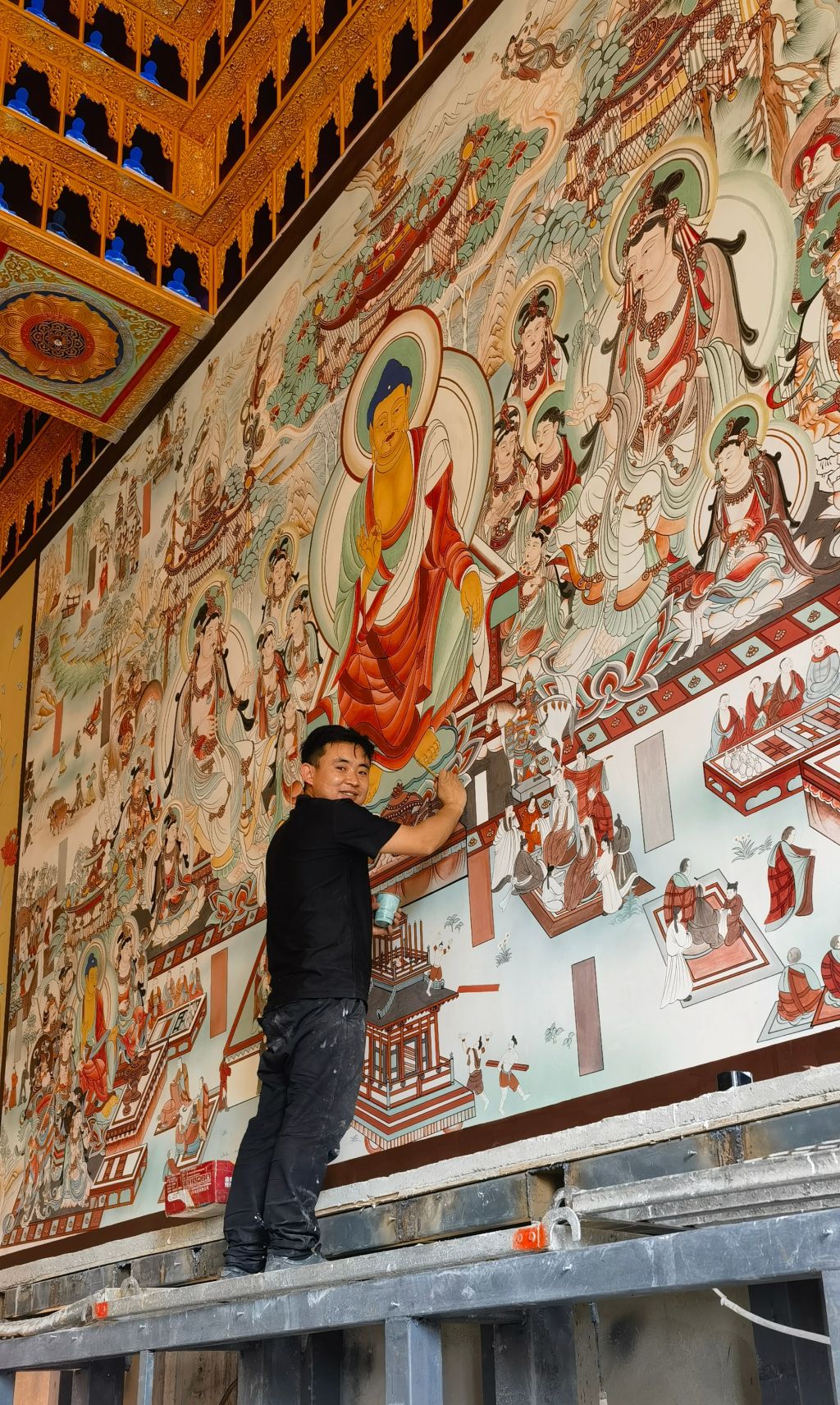 2011年毕业至今,田刚始终扎根传统壁画领域,用脚步丈量艺术版图。北京福佑寺的古朴壁画、香港东林寺的庄严彩绘、河南丹江大观苑的人文图景、内蒙古鄂尔多斯九成宫文化馆的历史再现、江苏海安市志开禅院的禅意表达、兰州报恩寺与常山寺的宗教艺术……全国多地的文化地标里,都留下了他精心创作的痕迹。不仅如此,他还投身国家级旅游文物壁画修复工作,以专业技艺修补岁月痕迹,让古老壁画重焕光彩,用行动践行着“守护文化遗产”的使命。