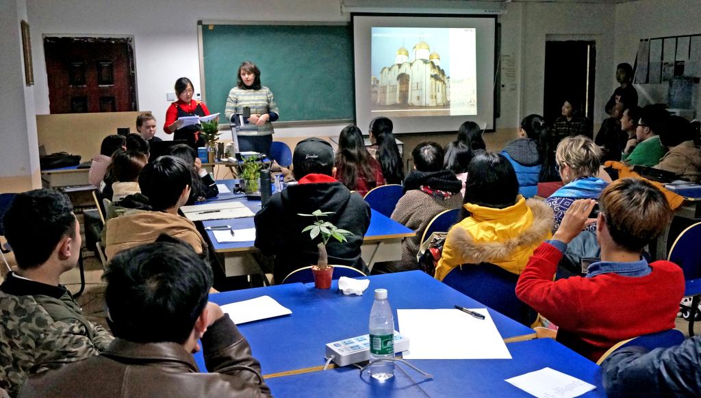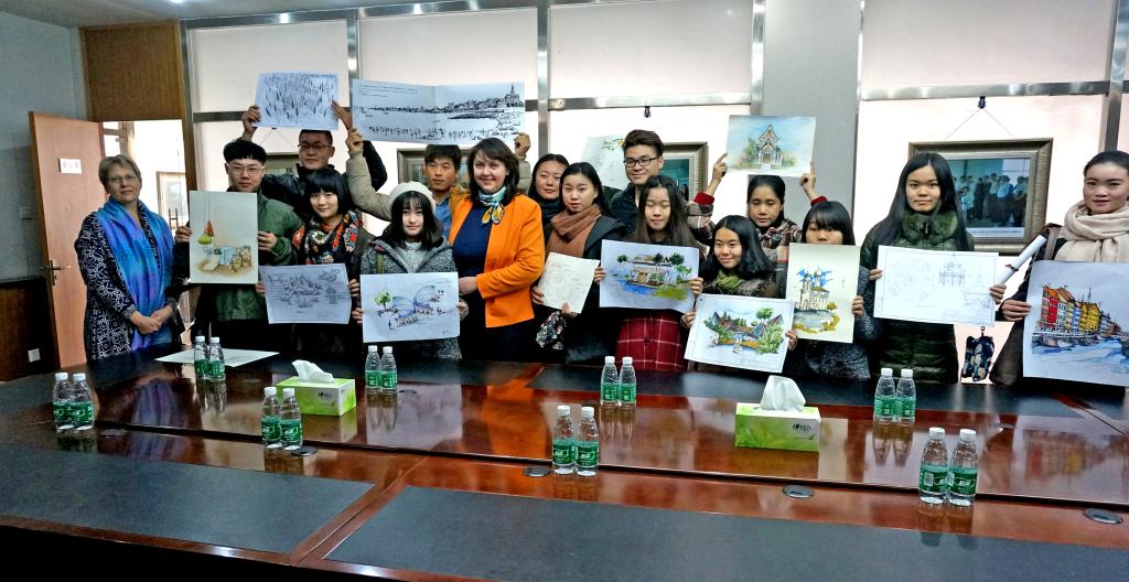 访问期间,随访的叶琳娜教授为best365官网师生做 “现代文化背景下的木质结构建筑”的精彩讲座,并与师生进行艺术交流。