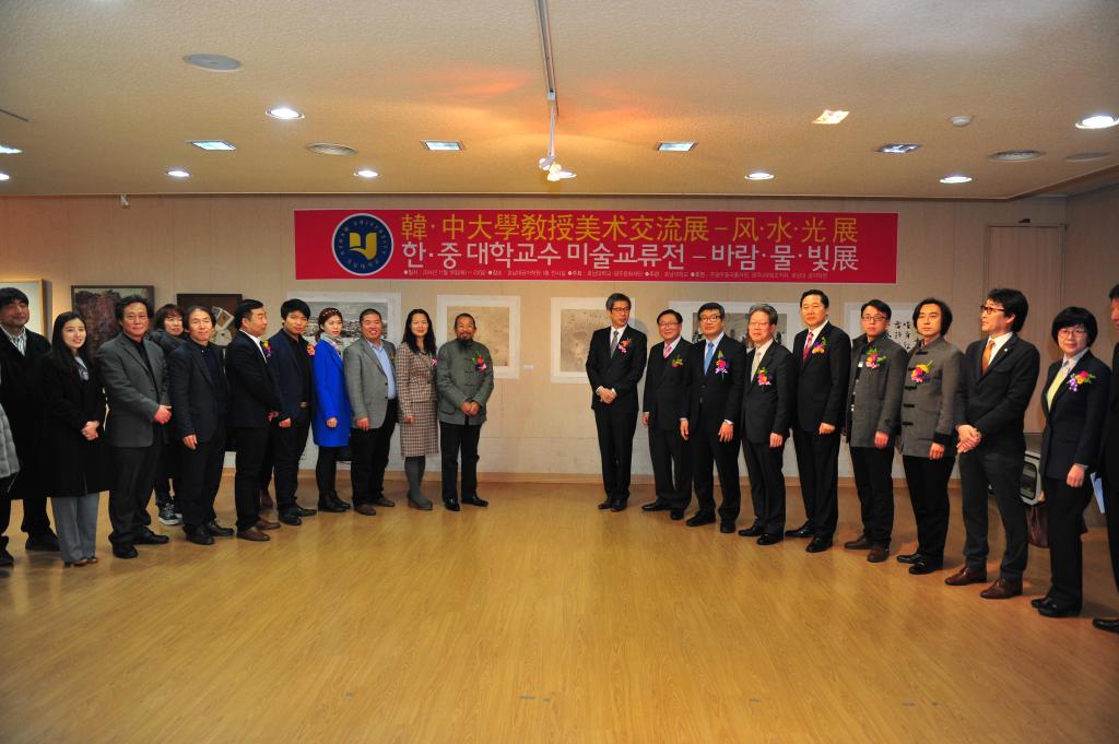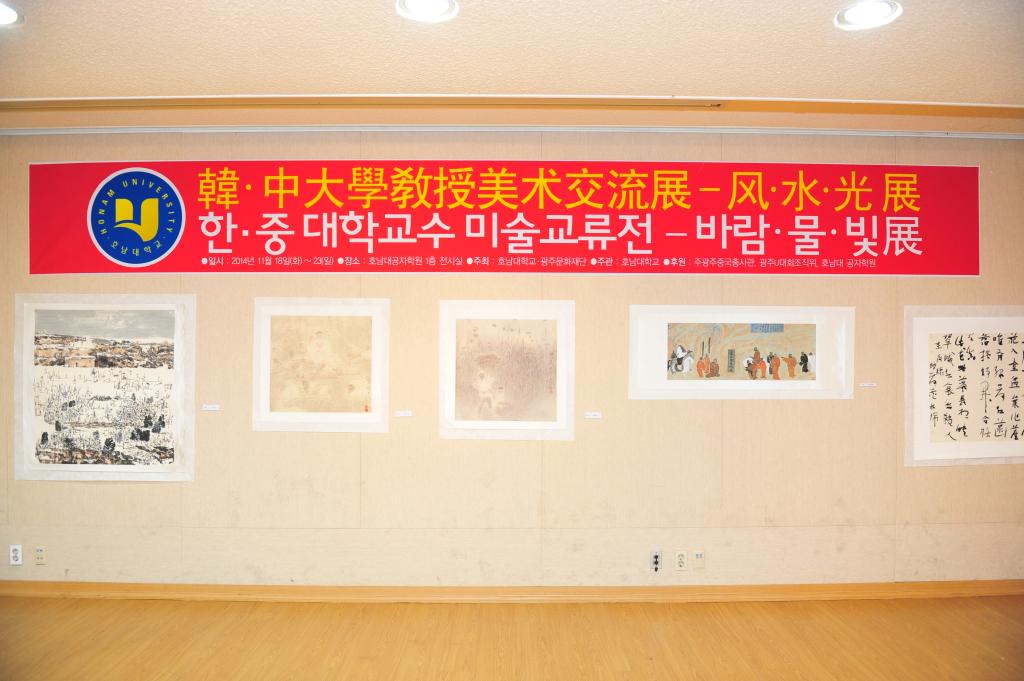 本次展览以“风、水、光”为主题,展览汇集了中韩两方传统与创新结合的艺术元素,共展出甄忠义校长《牧羊人》、《蛐蛐声声》、李明久教授《雪后》、林伟教授《壁画造像》、张建敏副校长《昆明池水浅》、张子言副校长《楷书》及韩方教授李政龙《序幕》、夏哲京教授《城山日出峰》等50余幅国画、油画、书法作品。韩国当地媒体《亚细亚经济》、《南道日报》、《广南日报》、《全南日报》等均对此次展览做了详细报道。当地媒体盛赞甄忠义校长既是享誉世界画坛的“朦胧画派”创始人,同时又是一位培养大批艺术人才的教育家,与中国艺术传统与文化传统一脉相承。