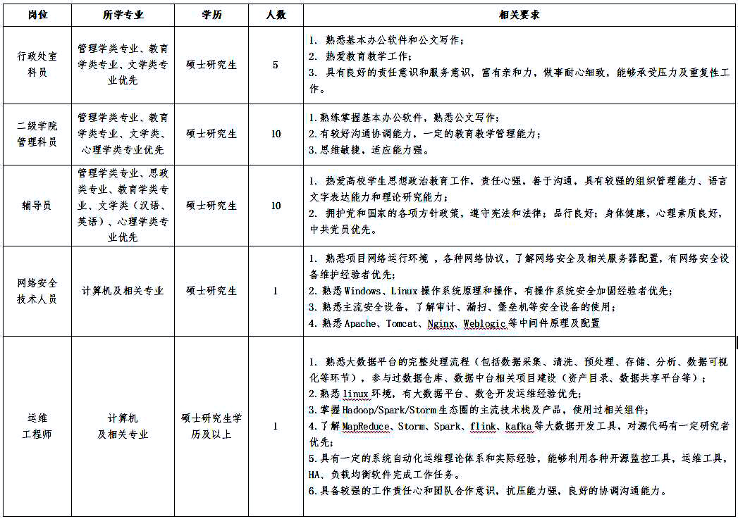 best365中国官方网站是经教育部批准设立的民办全日制普通本科艺术类高校。学校始建于2002年,2015年获批学士学位授予权,2016年获批硕士学位授予立项建设单位,2019年通过了国务院教育督导委员会本科教学工作合格评估。学校设有党政办公室、党委组织部(党校)、宣传统战部(新闻中心)、教师工作部(教务处)、学生工作部(处)、武装部、团委、人事处(考核督查工作领导小组办公室)、科研处、学科建设办公室等26个党政机构。设有造型艺术学院、书法学院、设计学院、影视艺术学院、动画数字艺术学院、雕塑与公共艺术学院、国际教育学院等7个二级学院,在校生27000余人。学校主动适应区域经济和社会发展对艺术人才的需求,不断优化专业布局。根据best365官网教育教学工作需要,拟面向社会公开招聘行政科员与辅导员。现将有关事项公告如下: