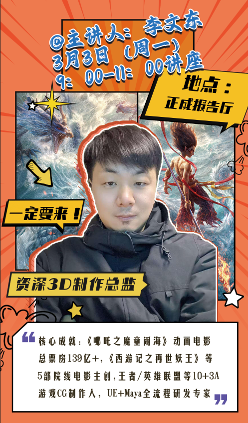 随着数字技术的飞速发展,动画产业正经历着前所未有的变革。为探讨数字技术如何赋能动画创作,分享国产动画电影的成功经验,动画数字艺术学院将于3月3日举办“数字浪潮重塑动画产业——《哪吒之魔童闹海》制片实践经验分享” 主题讲座。本次活动特邀《哪吒之魔童闹海》资产总监李文东先生作为主讲嘉宾,与业界同仁及动画爱好者们共同探讨数字时代动画创作的机遇与挑战。